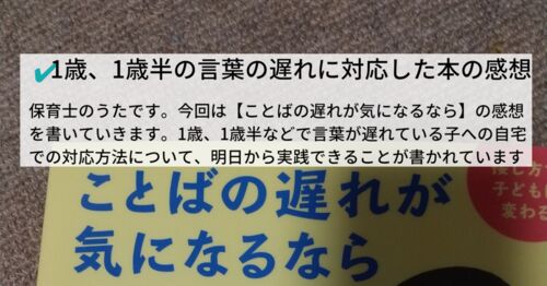 障害児施設で勤務する保育士のうたです。今回も、私が読んだ療育関係の本を紹介していこうと思います。今回は、【ことばの遅れが気になるなら】という、発達障害診断前の言語遅延のお子さんを持つご家庭向けに特化した本です。かなり良書でした✨✨ 1歳・1歳半…